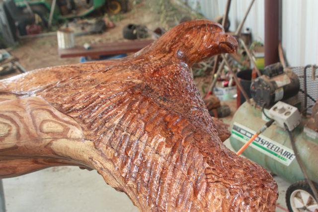 The evening is called “Art in Seguin…Seeing is Believing”, with the title of the exhibit: Visions in Wood: Marika and Her Students. Over thirty sculptures by Marika and ten of her students will be on display. The crowning event of the evening will be the unveiling of a 14-foot tall breath-taking wood sculpture of “Gwaihir” that Bordes created and brought to life with assistance of her students and friends. The inspiration for the sculpture comes from Gwaihir, an immense eagle from J.R.R. Tolkien’s Middle-earth who helped Gandalf escape and snatches Frodo and Sam from certain doom in the Lord of the Rings.