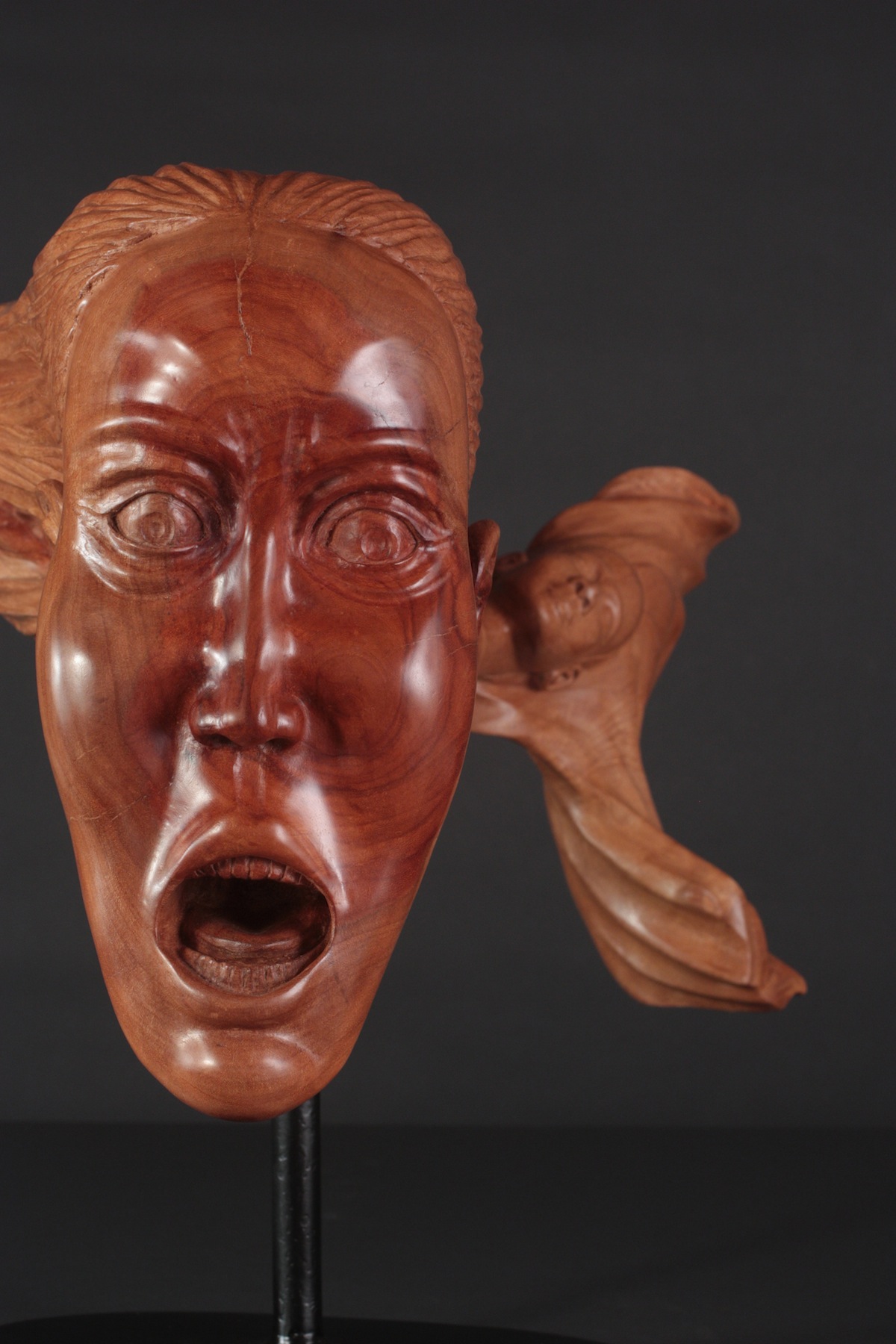 “Cry of Liberty” is Bordes’s newest sculpture and is of a woman whose face is in a screaming rage. Her hair seems to be pulled back by a fierce wind and at the tips unites to form a drum. Within the hair, a girl emerges from the strands. This piece is symbolic of women lifting the holds that bind so that their future daughters can be free. Each voice is like a beat on the drum within the hearts of women that becomes part of the song for freedom.