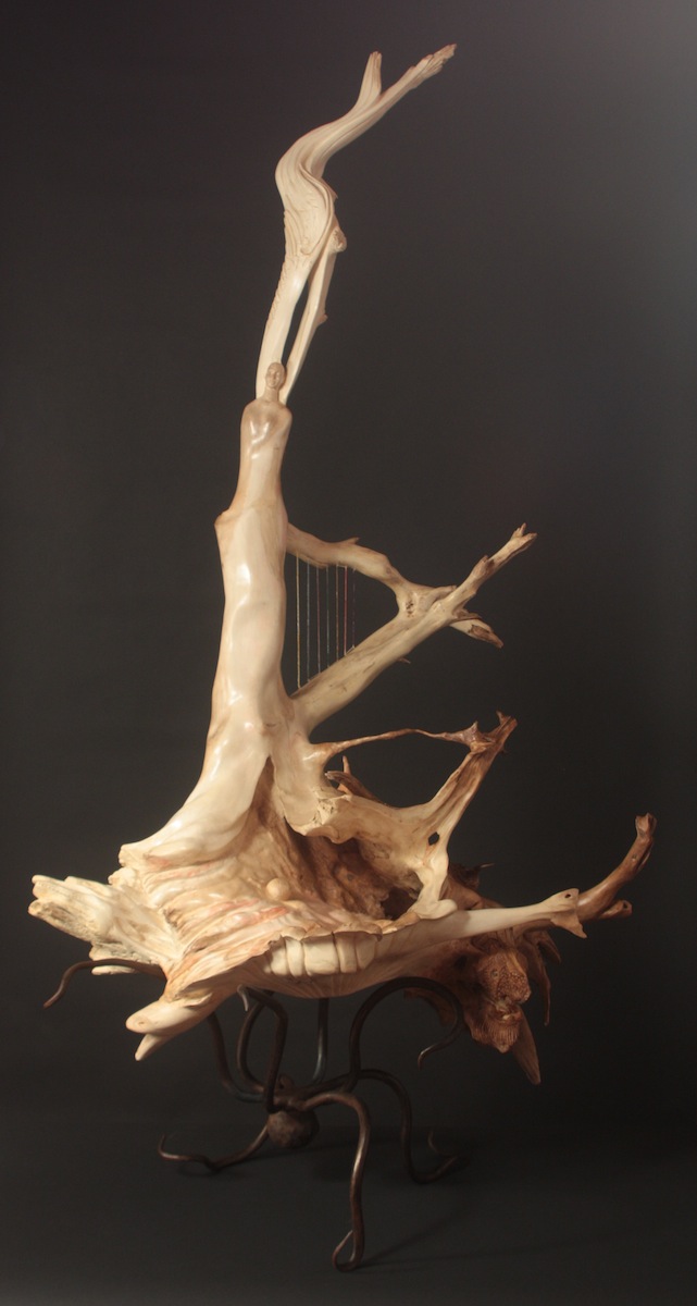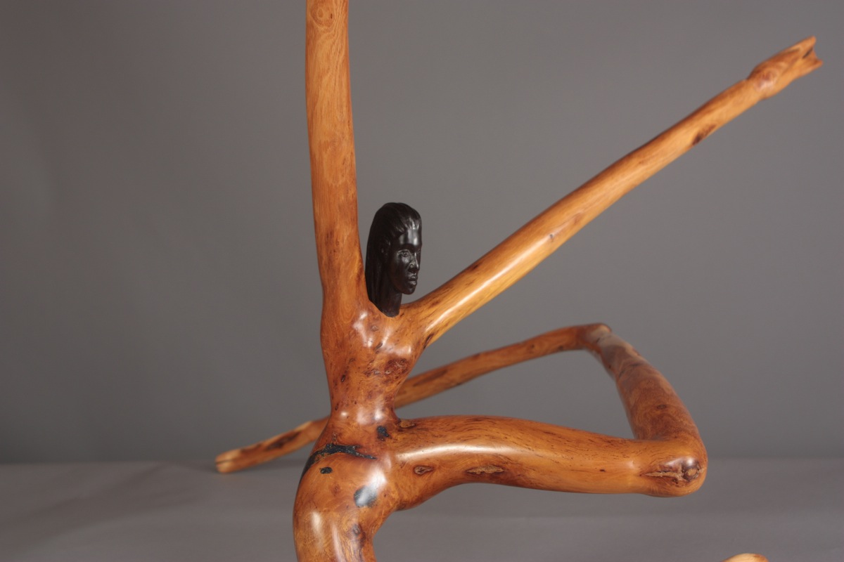 Other works in the exhibit are based in reverie, dreams transformed into chiseled and polished woods, some embellished with added materials— a bit of ebony, a semi-precious stone, forged elements.  In Dream to Fairytale (2013), what was once a knobby root is now a dreamlike womb, the birthing place of a goddess.  In other works, the human form is abstracted, elegant, long and lean, as in Grace (2010), a dancer-like apparition with ebony face and body of Bois d’Arc, a dense golden-orange wood native to Arkansas and parts of Texas.  One theme that prevails in all of Marika’s work, however, is her love for the feel of the wood, the elegant twists of its branches, the subtle changes in its texture and tone.